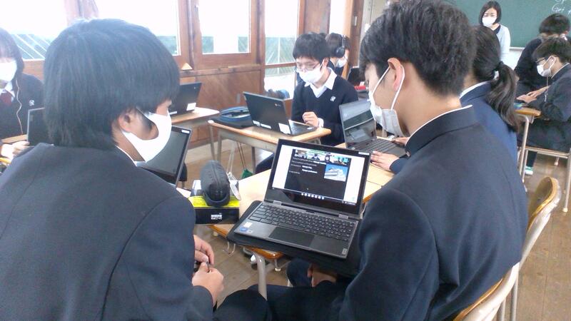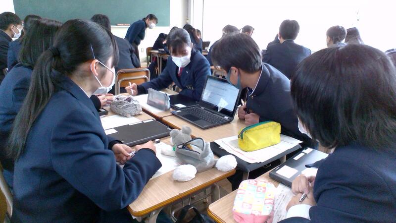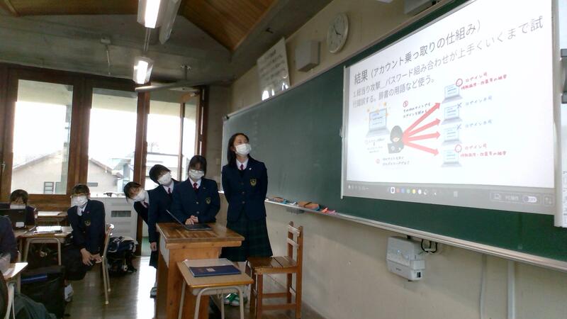発表前に担当の班で打ち合わせをする姿が見られたり、教室の前方に立ってスクリーンにスライドを投影して発表をしたり、クラスによっては班ごとにタブレットを見せあって発表をするクラスもあったりと様々な研究発表の様子が見られました。