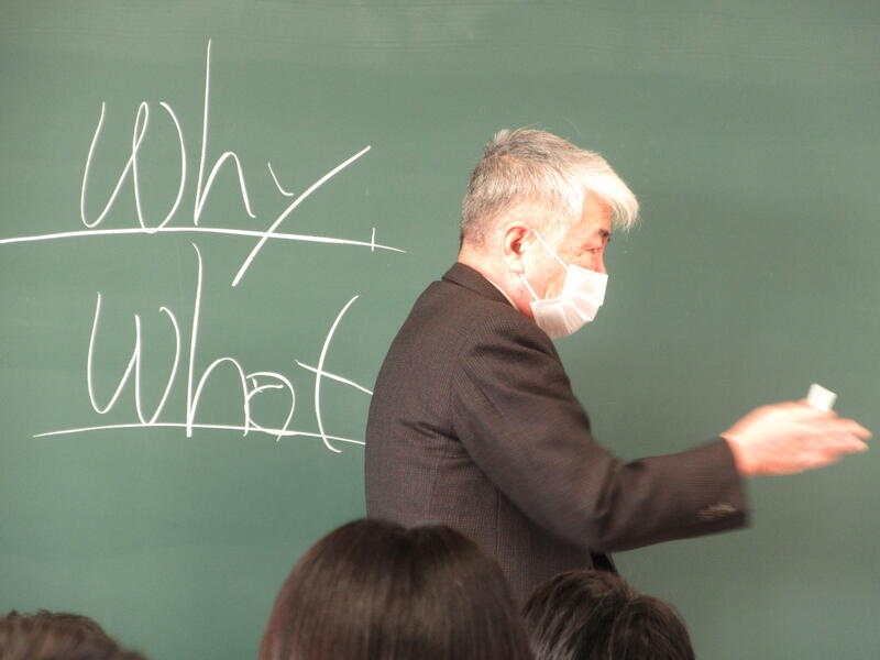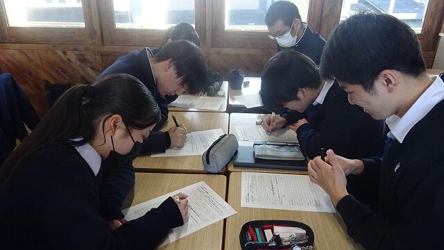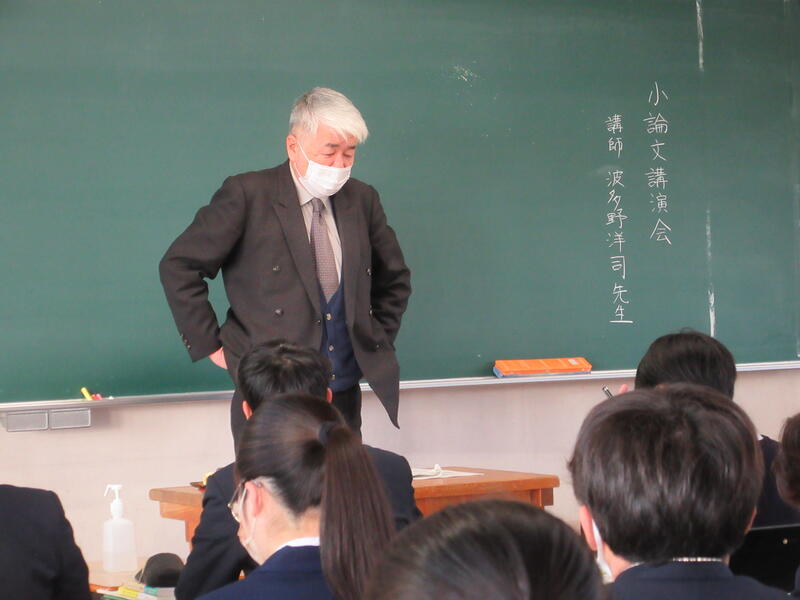 1月25日(木)に第2回小論文講演会を実施しました。受験に小論文試験が含まれる生徒が参加しています。9月の講演に引き続き、講師は波多野洋司先生です。参加生徒はメモをとったりうなずいたりしながら真剣に話を聞いていました。