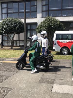 KDS熊本ドライビングスクールから3名の講師をお招きし、原付の基本的な取り扱い方の確認や基本的運転技術の練習など、丁寧なご指導をして頂きました。