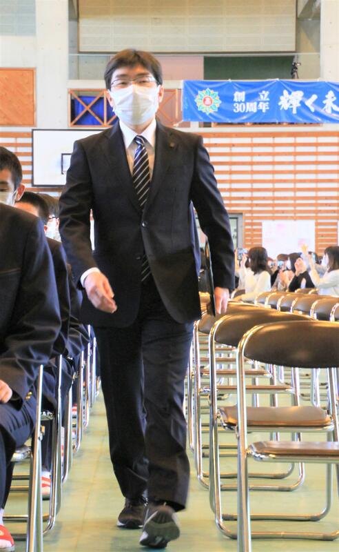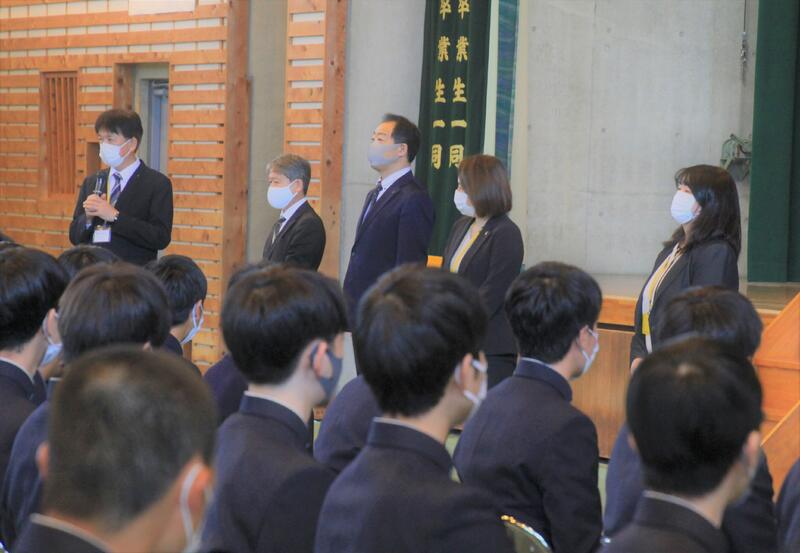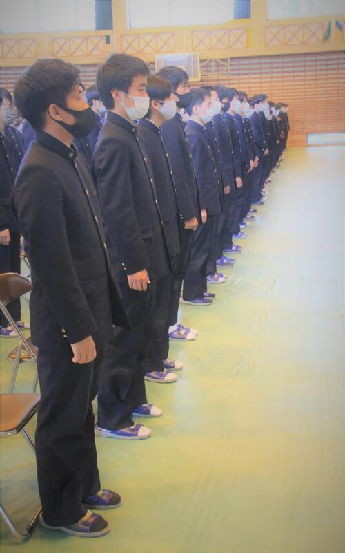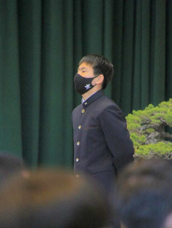 コロナ感染症対策のため、今年度も2〜3年生の代表生徒(生徒会執行部)が1年生に向けて、挨拶をしました。