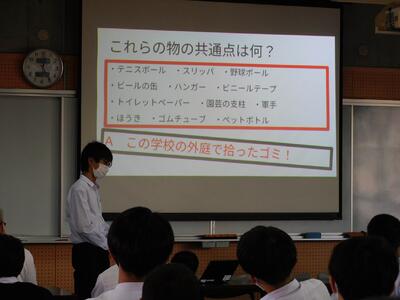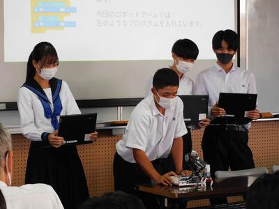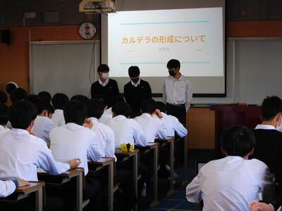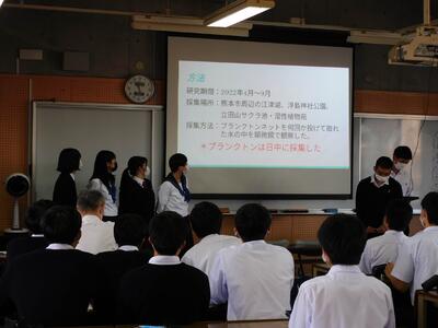 理数コースの1,2年生は週に1回科学研究の時間があり、物理、化学、生物、地学、数学、ロボットの6班に分かれて研究をしています。今日は中間発表会がありました。