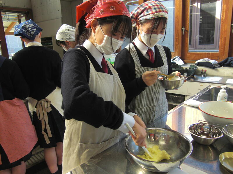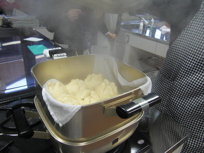 加熱調理し、高校生に大人気の包子饅頭を作りました。蒸し器の蒸気があったかさを伝えています。残念ながら持ち帰りですが、おうちで温め直して心と体を温めてください。