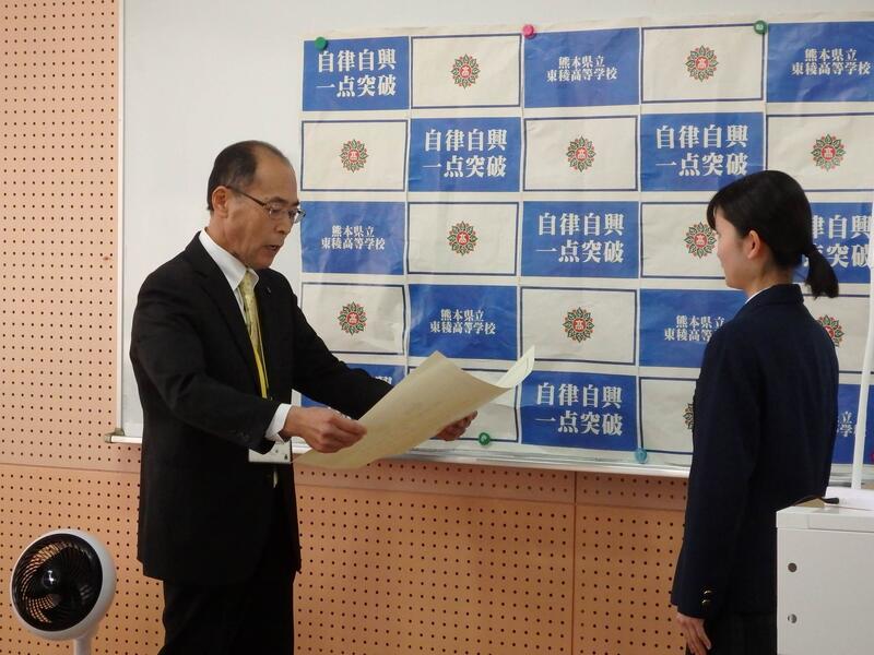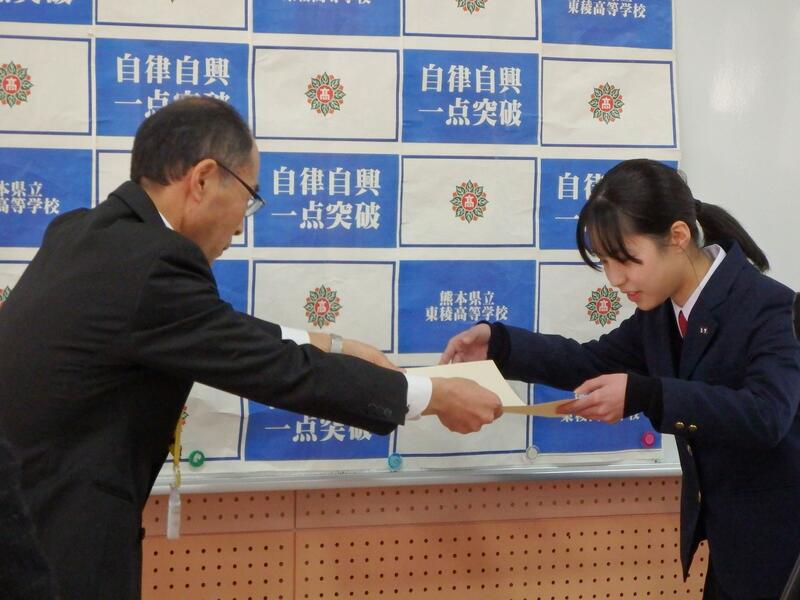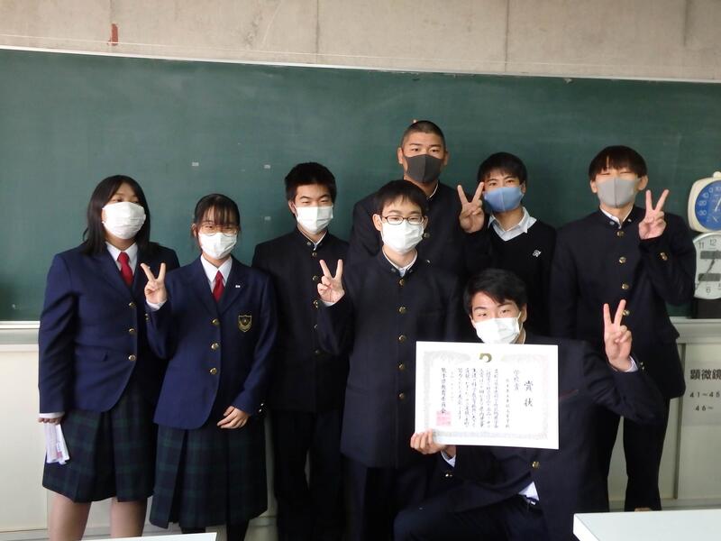 熊本県科学研究物展示会(科学展)の学校賞の賞状を受け取りました。この学校賞は入賞がちょうど5の倍数になる学校がいただく賞です。今回で入賞が20回になりました。理数コースの先輩や生物部など科学系部活動の先輩方が出品し、入賞を重ね、今年20回目の入賞となりました。今後も研究を頑張ります!