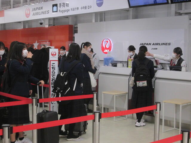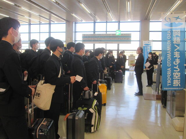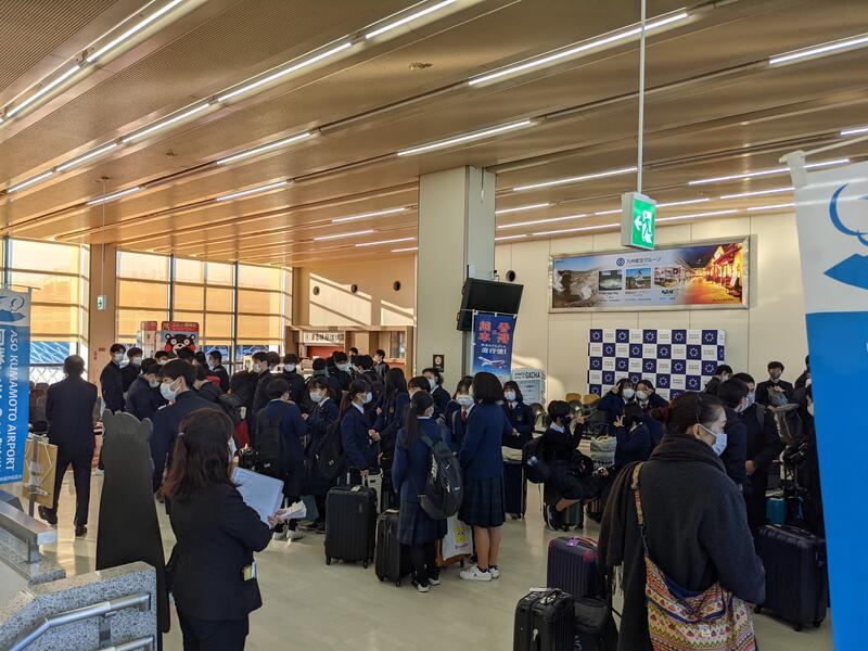 12月5日(日)2年生が修学旅行に出発しました。2年5・6・7・理数・国際の5クラスは10:40分発JAL626便に搭乗、2年1・2・3・4組の4クラス10:55分発ANA644便に搭乗しました。写真は熊本空港での様子です。