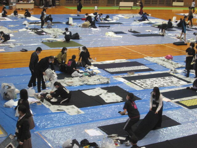 テーマ発表から準備期間は約3日でした。行書、草書を用いて晴れやかに空間美を創出するコンセプトで、2グループに別れての席上揮毫、チャンスは2回(二枚)です。普段小字数を書くことはほとんどないため、苦心が伺えました。審査は指導員の吉田先生にお願いしています。結果が楽しみです。