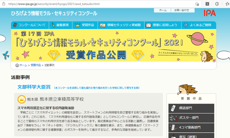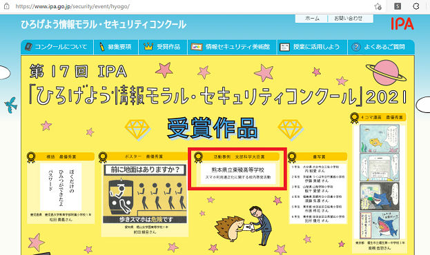 第17回IPA「ひろげよう情報モラル・セキュリティコンクール」2021にて、本校の【スマホ利用適正化に関する活動】が学校活動事例部門で文部科学大臣賞を受賞!(2021/12/16)
