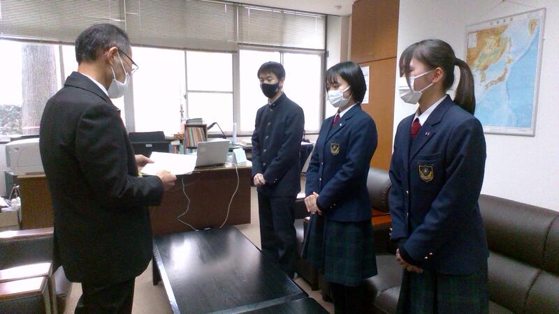 このことについて、生徒を代表して生徒会長の森元くん、風紀委員長の鮫島さん、4コマ漫画部門で熊本県警本部賞を受賞した莟さんが放課後、校長先生に報告に行き、お言葉をいただきました。また、本人たちも受賞を受けて感想を述べました。