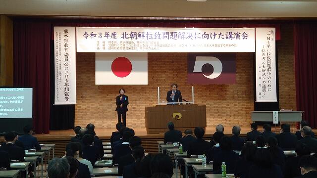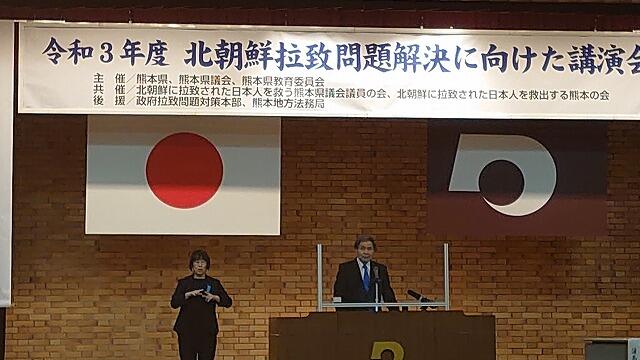 12月11日(土)県庁にて、拉致問題の解決について考える講演会が行われました。蒲島知事の挨拶の後、「一日も早い拉致問題解決に向けて~私の考える解決への道筋~」と題して蓮池薫さんの講演がありました。蓮池さんは、「一日も早い解決に向けて、日本は独自に拉致問題に絞った交渉が必要だ」と訴えた。1980年に拉致された松木薫さんの弟松木信宏さんと、78年に拉致された増元るみ子さんの姉平野フミ子さんも登壇され、帰国を待ちわびる家族の声を伝えられました。鹿本農業高校生徒の発表もありました。