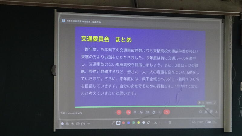 各委員会からの活動報告と活動計画の発表、生徒の質問や意見に対する回答などを通して、学校全体で、学校をよりよいものにするため取り組みについて考えていきました。