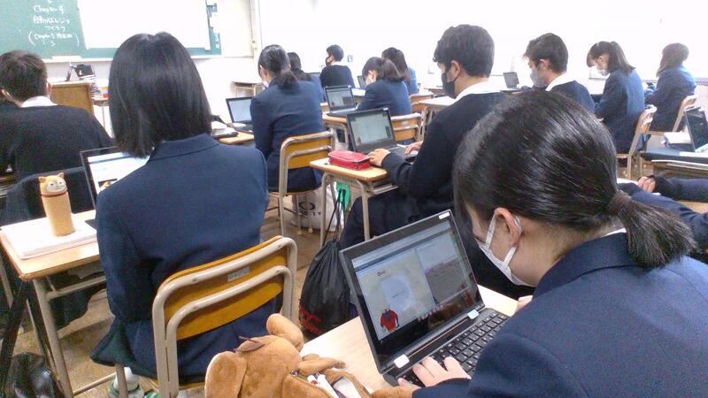 1限目、「社会と情報」の授業では、Webページ制作とプログラミングについて学んでいます。各HRの教室で、一人一台端末を使い、ウェブコンテンツを利用して学習を進めています。