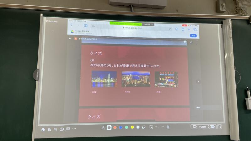 (※スクリーンが白く見えますが、教室にいる生徒たちにはしっかりと映像・音声は配信されています。)