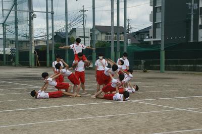 その後、初めて音楽も流して東稜体操・ダンス・組み体操と、マスゲームを通して行いました。