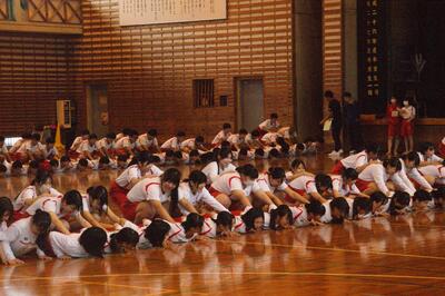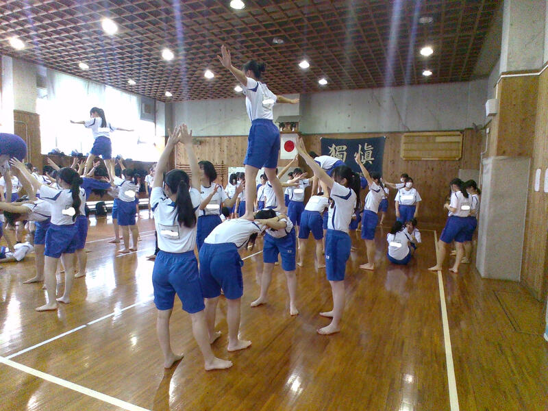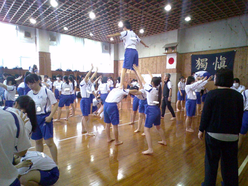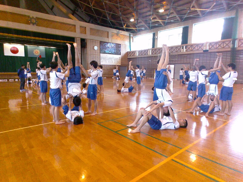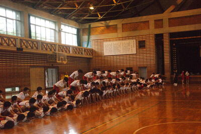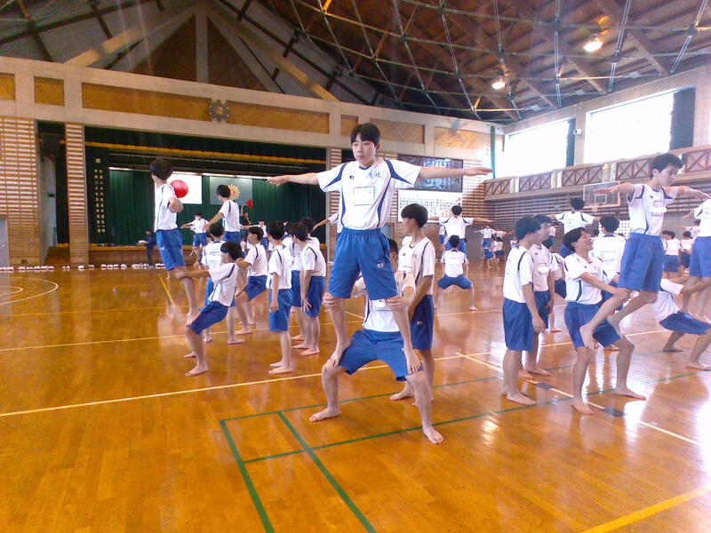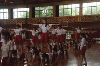 雨のため、体育館と武道場を利用して組体操の練習でした。前回確認した隊形移動と技を組み合わせ、明日の全体練習に向けて、頭を使い考えることの多い時間となりました。