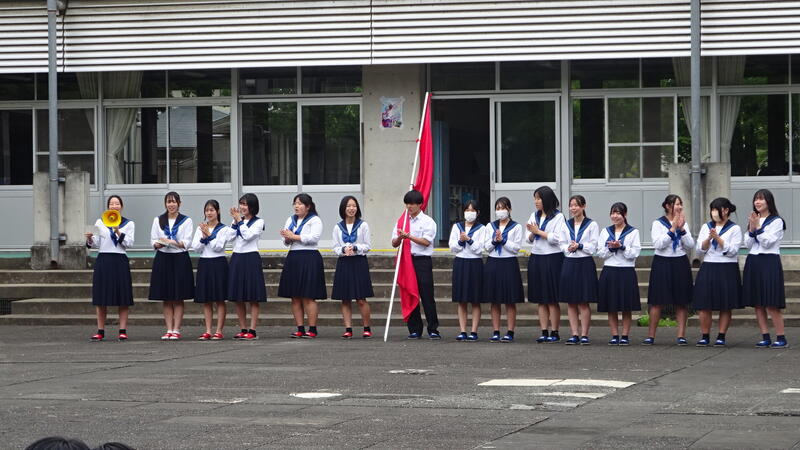 演舞・太鼓の音と合わせて、ウェーブの形作りと声出しの応援練習も行いました。