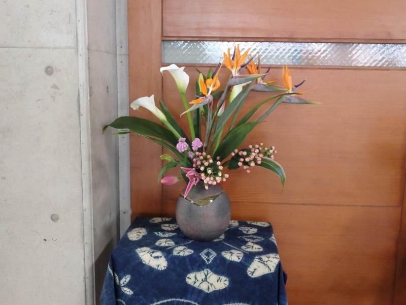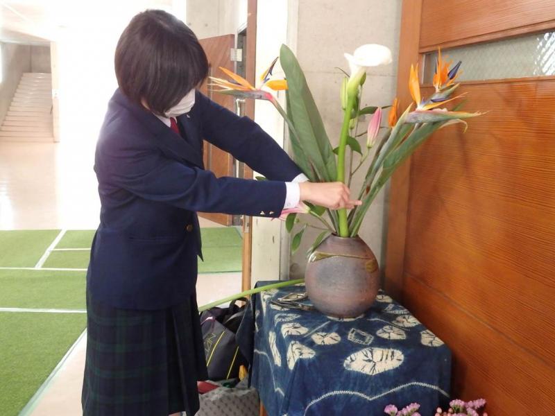 華道の外部講師の先生のご指導のもと、入学式に向けて体育館にお花を生けました。明日は始業式と入学式なので、多くの人に見てもらいたいです。
