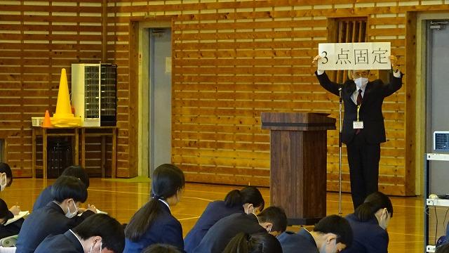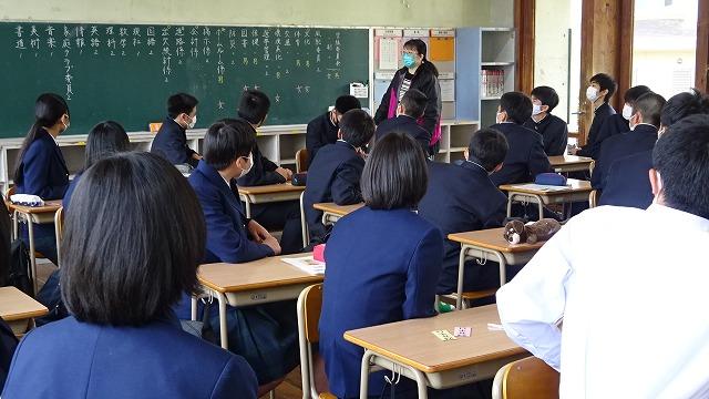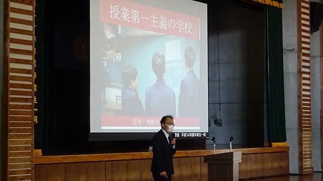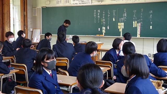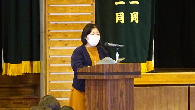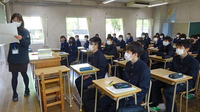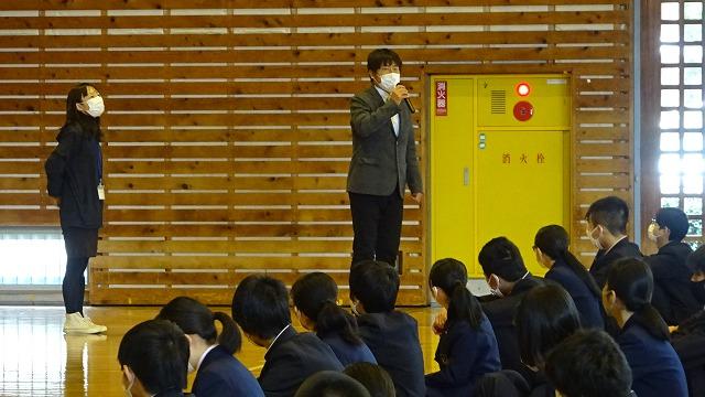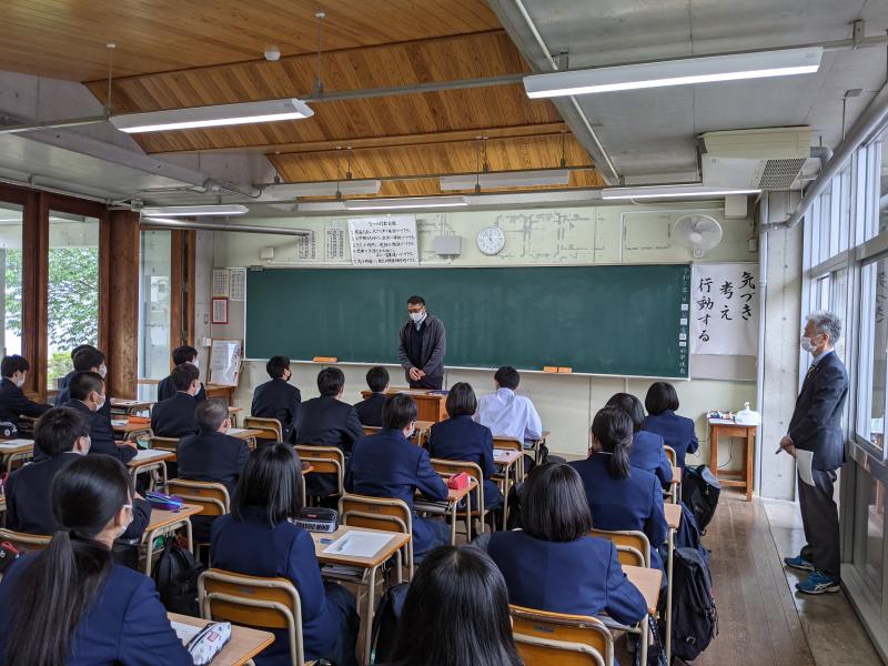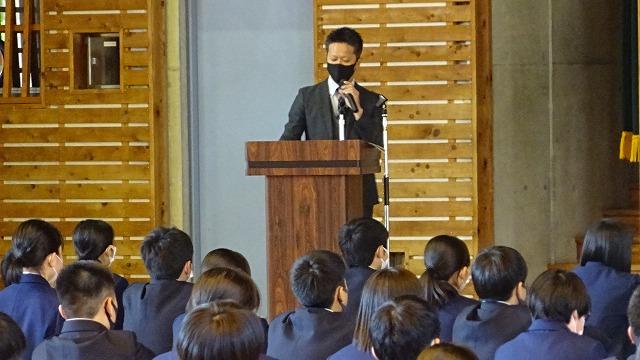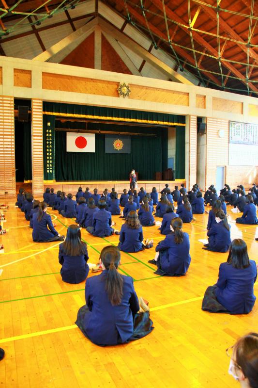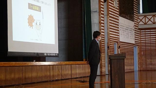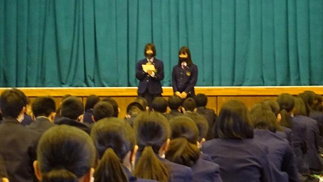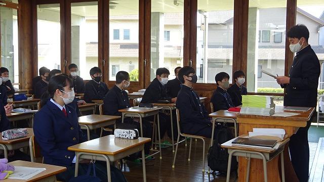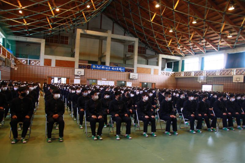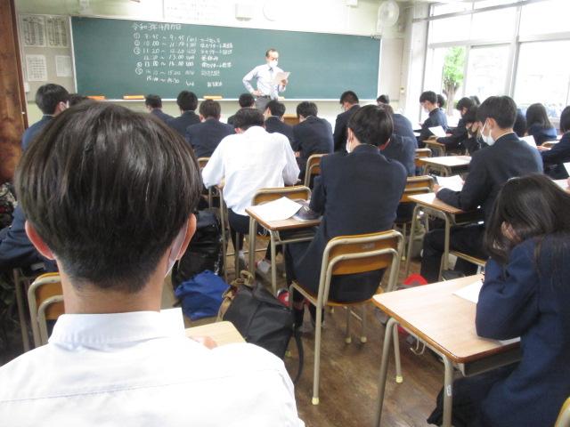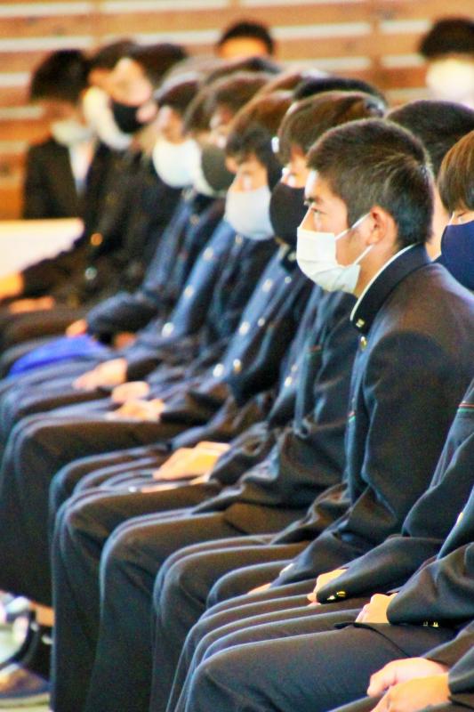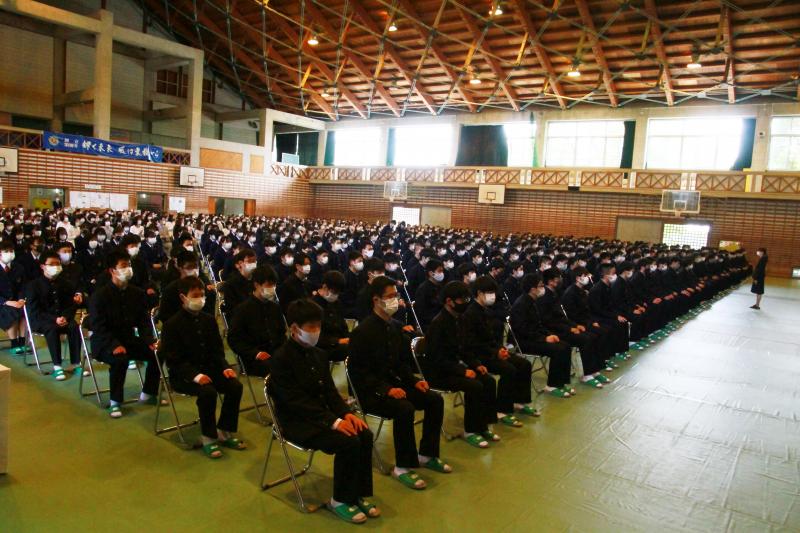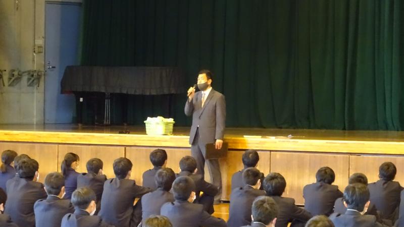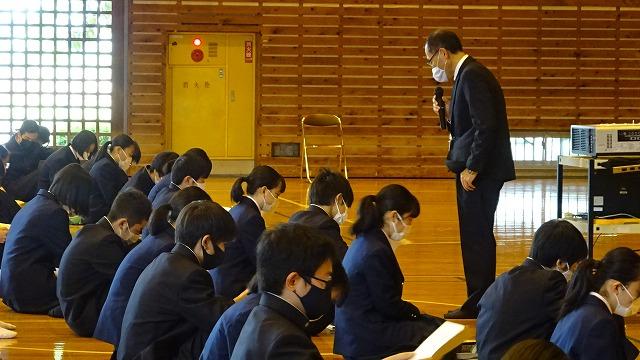 生徒指導主事の村本先生より交通についてとスマホについての大きく2つについてお話がありました。本校では多くの生徒たちが自転車通学をしており、特に朝の時間帯は学校付近の交通量も多いです。一人ひとりが交通ルールを遵守し“死亡事故ゼロ”となるよう最大限の注意をしてほしいとのお話しがありました。またスマートフォンの使い方、SNSの使い方等を各自がしっかりと考え、「自己指導能力」を育成してほしいとのお話もありました。