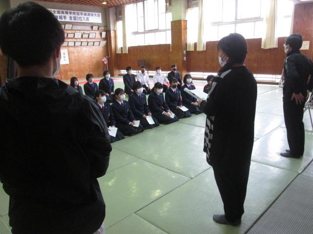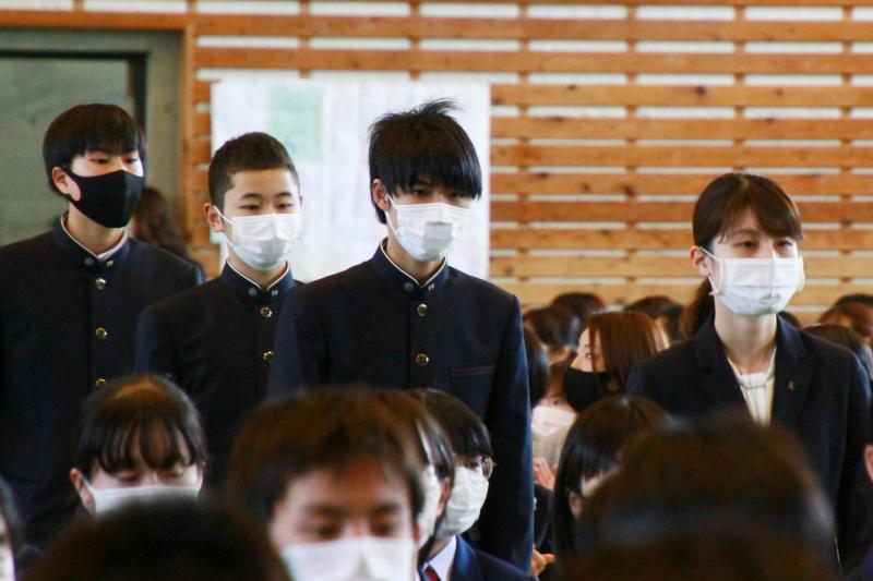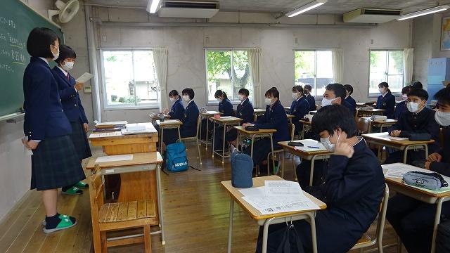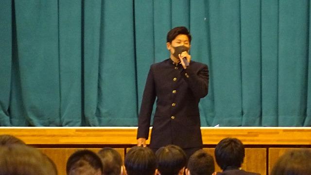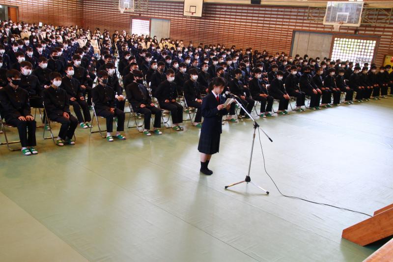 新入生と2・3年生の対面式を行いました。感染症対策のため、2・3年生を代表して、生徒会長村枝君が話をしました。