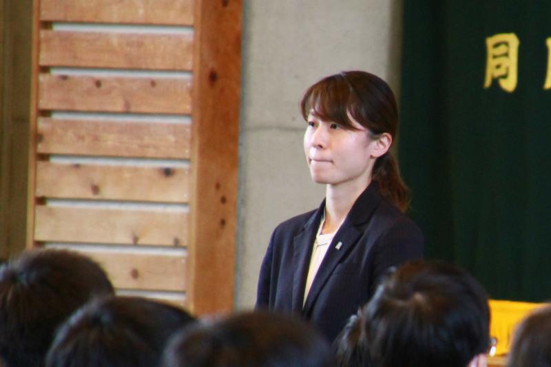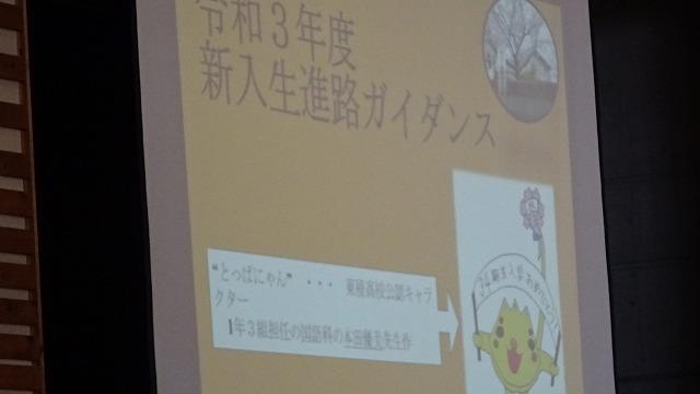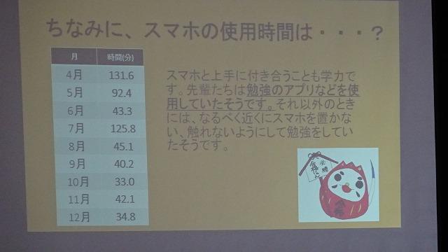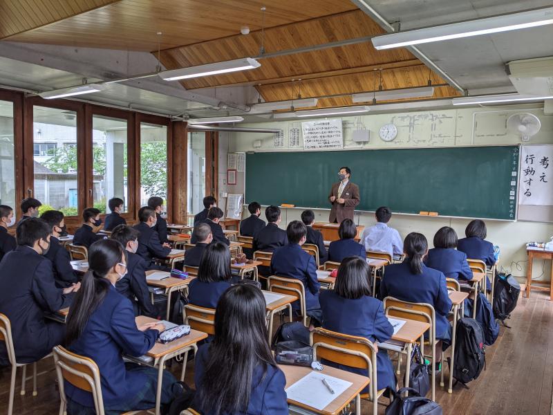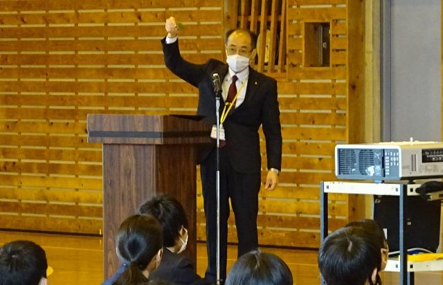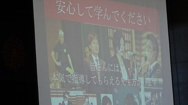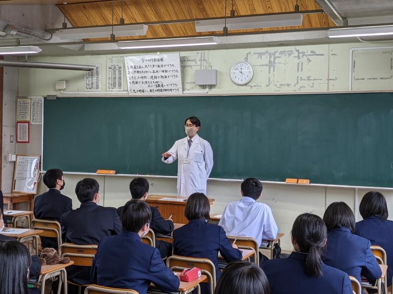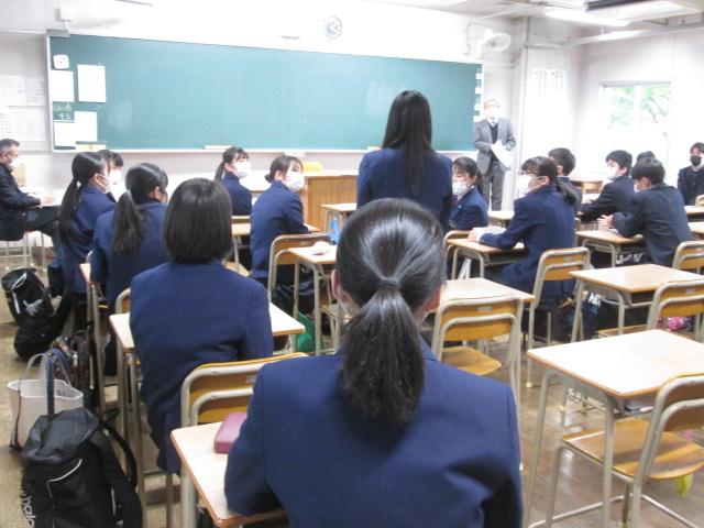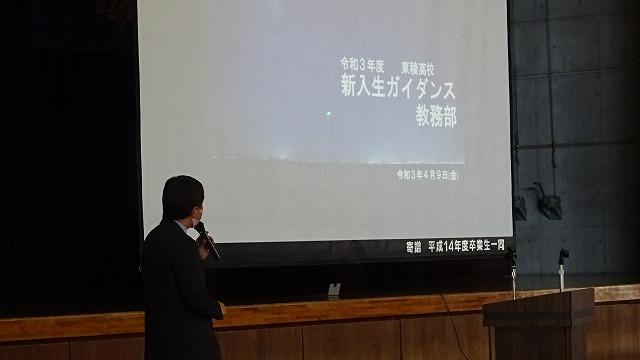 お昼休みをはさみ、午後からはまず研究企画兼情報管理部主任の竹中先生よりお話がありました。東稜高校の指導方針等の紹介に重ねて様々な言葉を生徒に紹介されました。「授業第一主義」「生き方在り方を育てる」「心温かきは万能なり」「何をしてもらうかではなく何ができるか」「(高校生は)守られる側ではなく守る側」「素直さは知性」「大切なのはこれからどう生きていくか」等々。スマホとの付き合い方を考える、生活習慣を整える、努力の見える化をすることも大事だというアドバイスもあり、生徒たちは様々な言葉をメモしていたようでした。