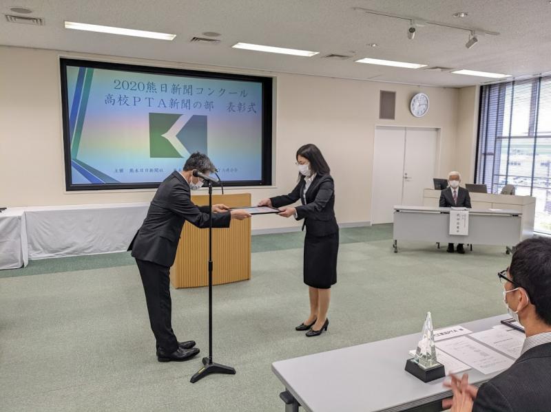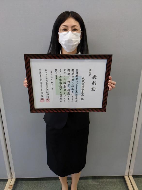 2020年度熊日新聞コンクール高校PTA新聞の部で、育友会広報紙「東稜会報」が優秀賞を受賞しました。4月10日(土)の表彰式には、広報委員長の田尻さんが出席。