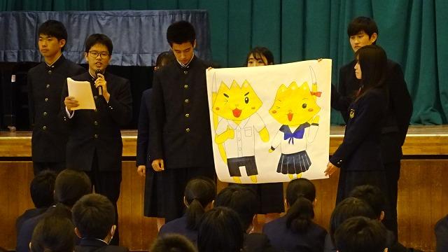 東稜高校応援キャラクター「とっぱにゃん」について説明する様子