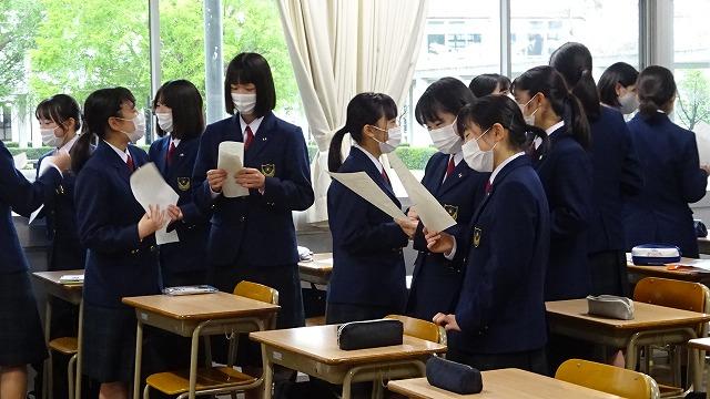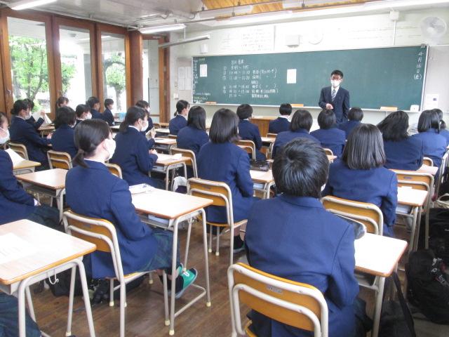 学年団一人ひとりの自己紹介と校訓校歌の紹介を行いました。2年前の卒業式での先輩方の校訓唱和の映像も見ました。学年主任の森田先生からは、1年生全員が体育館に5分前に集合したことに対するお褒めの言葉とともに、挨拶をしっかり頑張ってほしいという激励が飛んでいました。