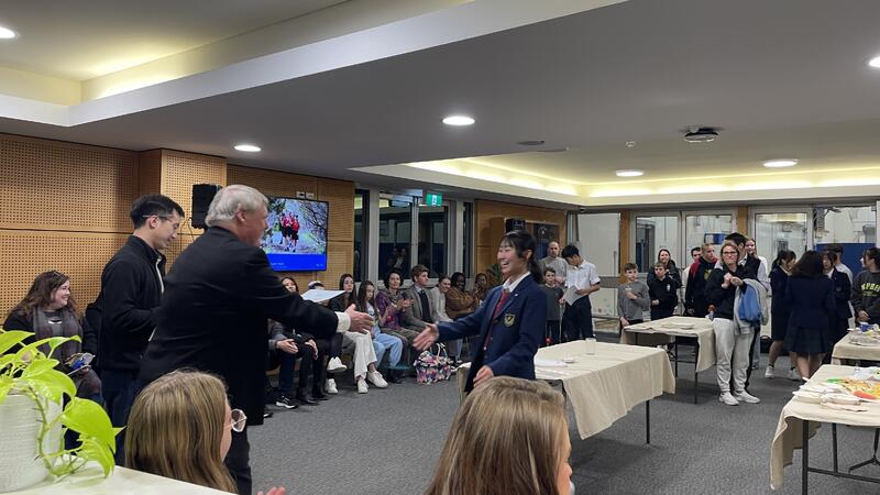 生徒会長の橋本くんは英語で歓迎の言葉を述べました。