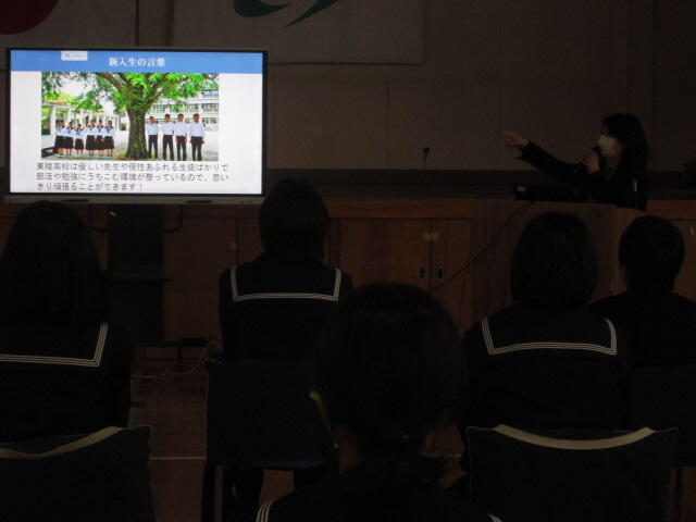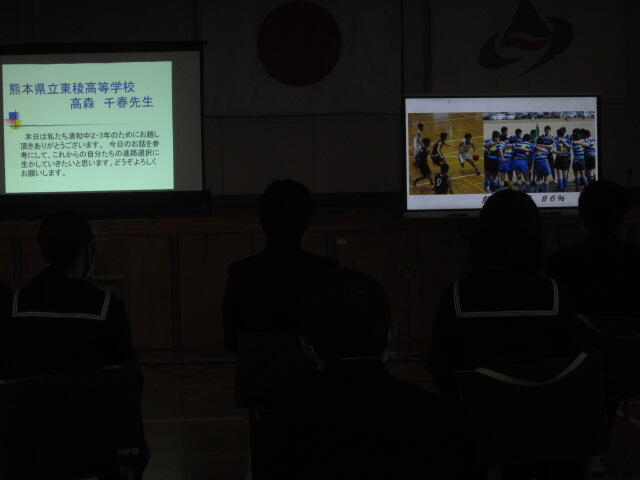 3年生・2年生みなさんの元気の良いあいさつからはじまり東稜高校について20分間の説明を行いました。現在、東稜高校の学び舎では2名の清和中学校出身の生徒が過ごしています。2人とも東稜寮に入って頑張っています。東稜高校が選択肢の一つとなれば幸いです。勉学、スポーツ頑張ってください。