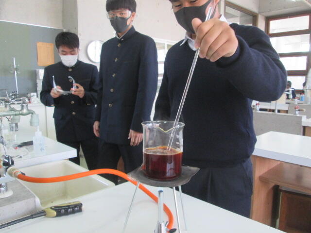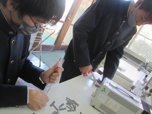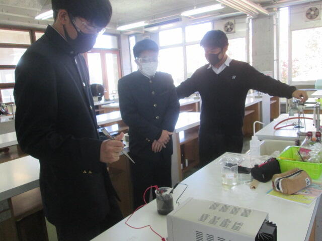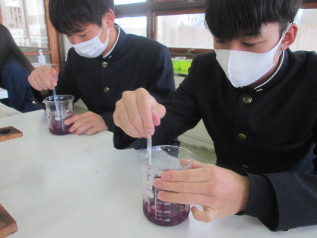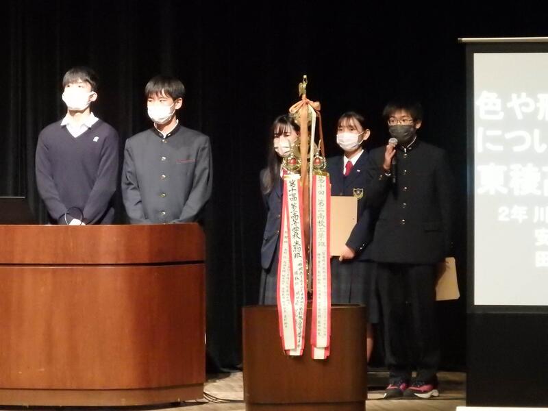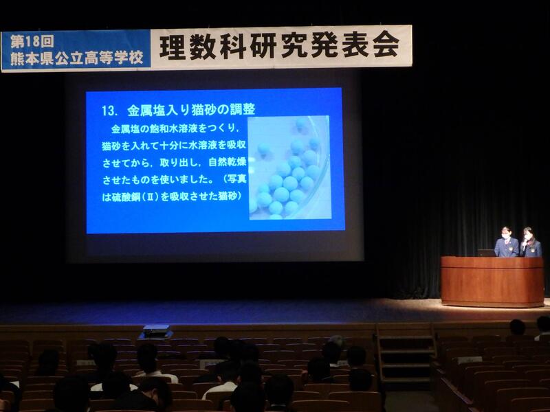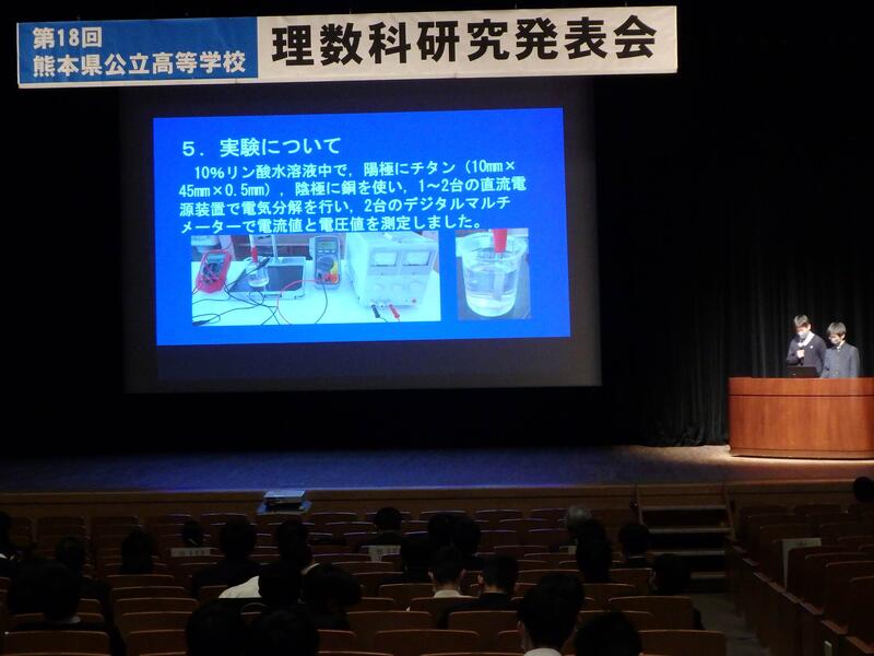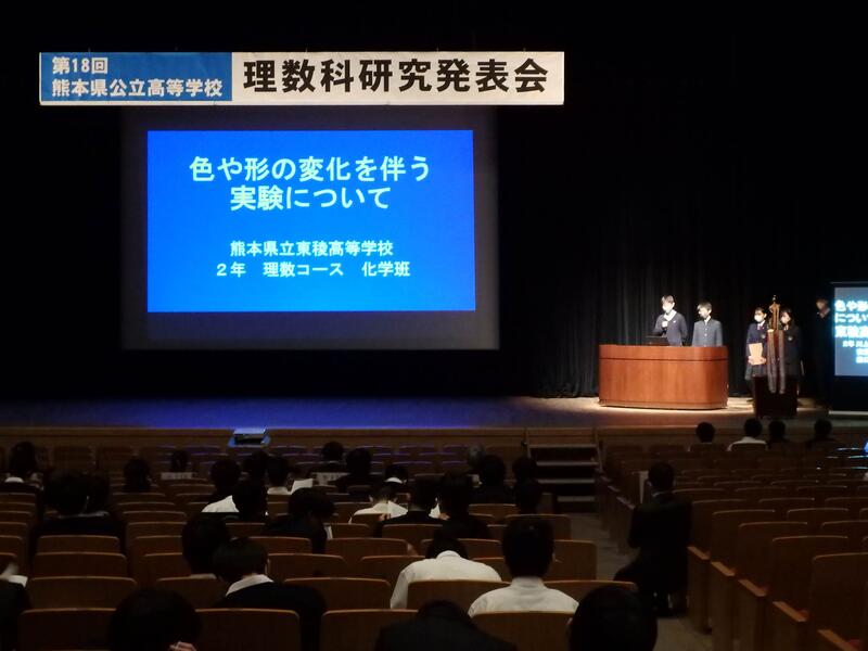 県内の公立高校の理数科の研究発表大会がシアーズホーム夢ホール(熊本市民会館)で行われました。理数コースからは化学班の「色や形の変化に伴う実験について」を発表しました。