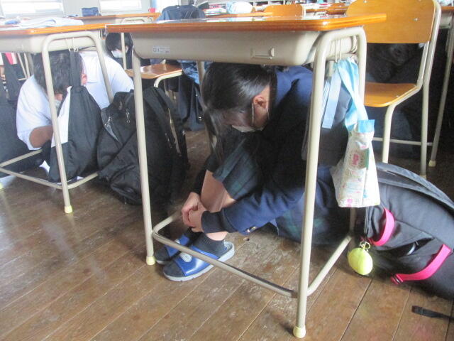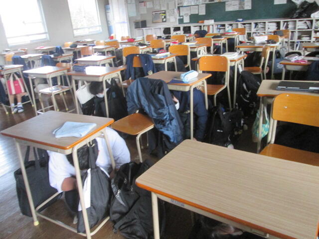 雨天のため、各教室で避難経路の確認や点呼を行いました。