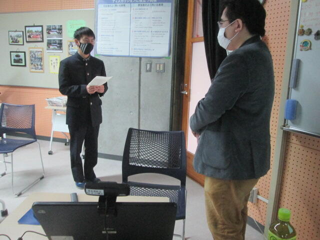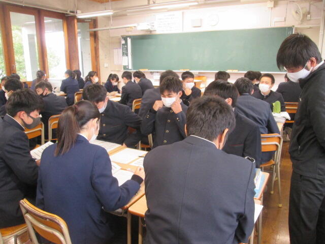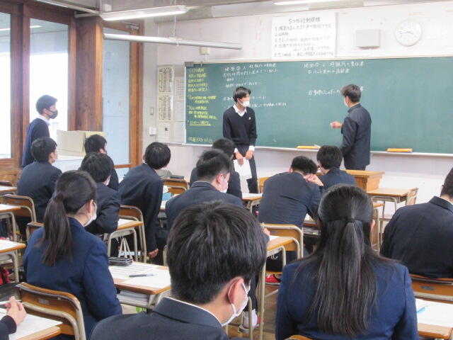 古江副校長先生、進路指導部橋口先生、木田学年主任から激励があり、生徒を代表して、村枝君が、「これまで教えていただいたことに感謝します、・・(中略)・・3先生全員が一致団結して最後まで頑張り続けます」と決意の言葉を述べました。