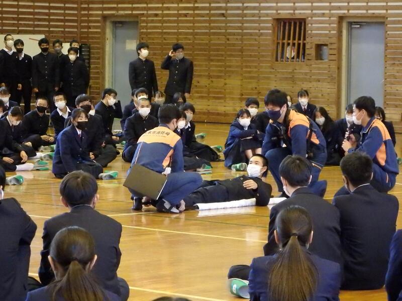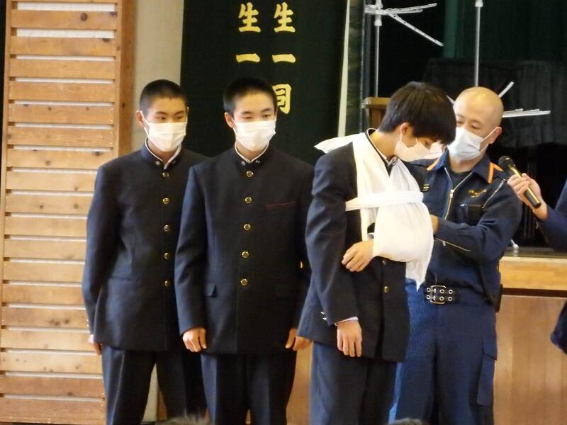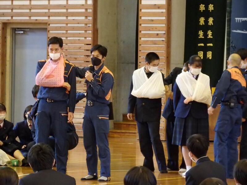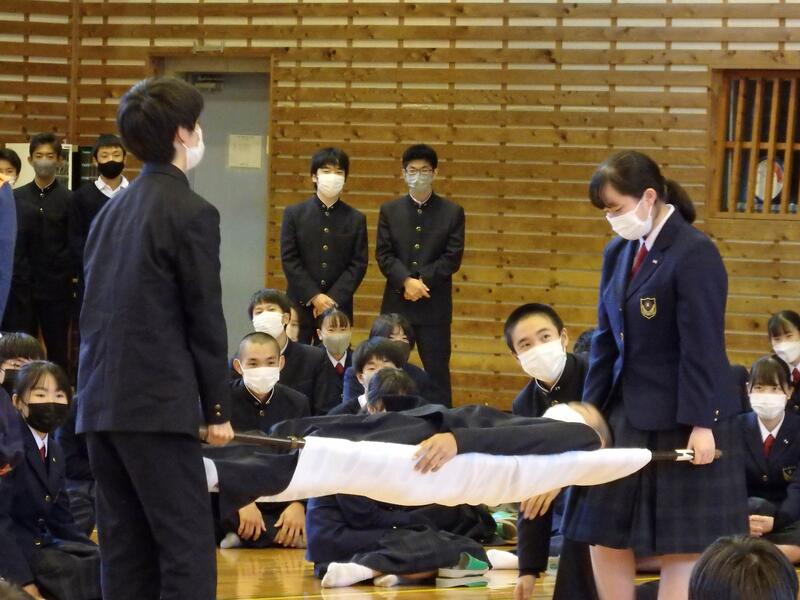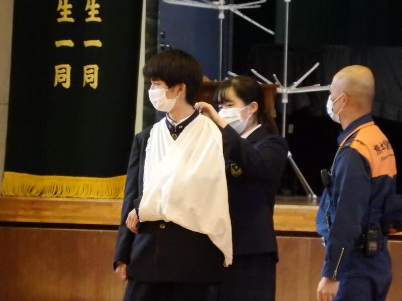 応急担架や応急処置等の作成や方法を実施し、災害時の対処能力を身につける。