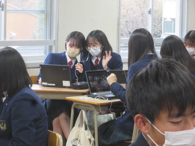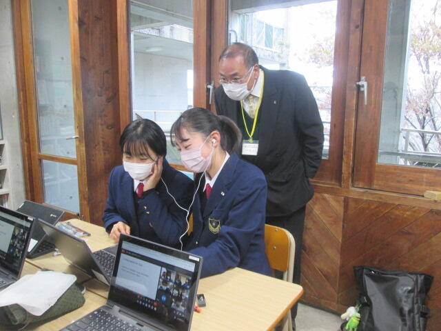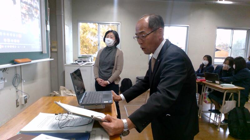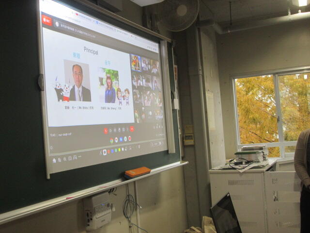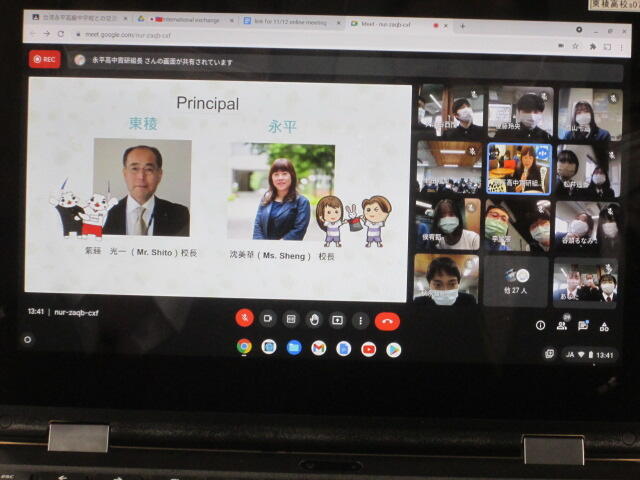 11月12日(金)国際コース2年生が台湾新北市立永平高級中学校の生徒とオンラインで交流会を行いました。Sheng校長先生と紫藤校長先生のご挨拶のあと、全体で写真を撮り、7つのグループに分かれ、自己紹介を行い、それぞれのテーマで台湾と日本の紹介や意見を交換し合いました。紫藤校長のご挨拶です。