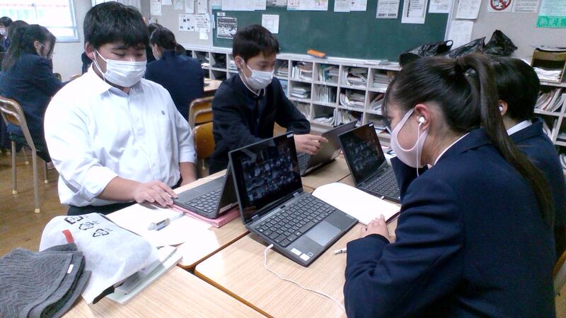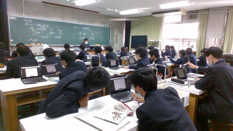 1限目、「社会と情報」の授業では、Webページ制作とプログラミングについて学んでいます。各HRの教室で、一人一台端末を使い、ウェブコンテンツを利用して学習を進めています。
