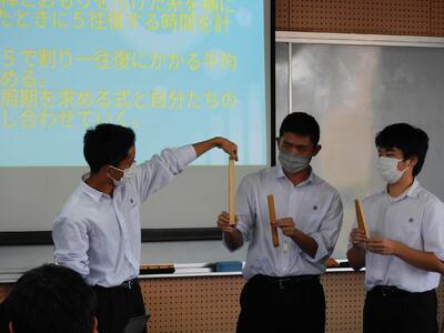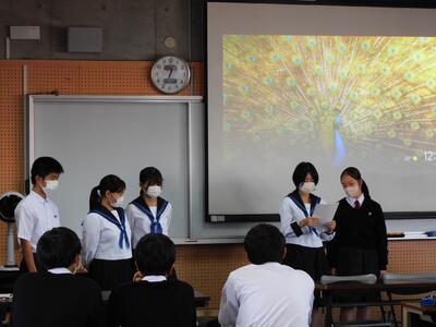 理数コースの1,2年生は週に1回科学研究の時間があり、物理、化学、生物、地学、数学、ロボットの6班に分かれて研究をしています。今日は中間発表会がありました。