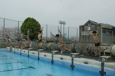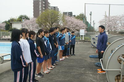 水温は18℃ぐらい。ほとんどの生徒がすぐにプールから上がる中、早速練習を始める生徒と先生もいました。