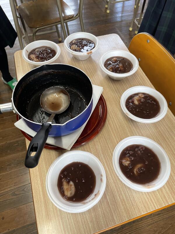 休日勉強会に参加している3年2組の皆でぜんざい会を開きました。