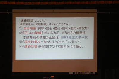 「あなたは自分の出口をどう考えていますか?自分の将来をどう考えていますか?」将来のことを考えるうえで、現在の学習面、生活面について見つめ直すことが大事だという話がありました。