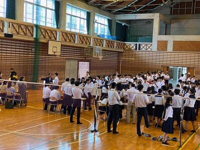 体育館では全校生徒で台湾の高校生を迎え、歓迎会を行いました。