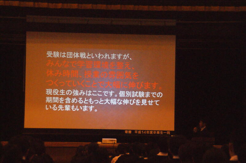 受験勉強にスイッチが入ったエピソードや楽しいことを見つけて、仲間を見つけて切磋琢磨した話、規則正しい生活を心がけたこと等をお話していただきました。一生の中で頑張れる期間があってもいい。これ以上頑張れないというくらいの期間。受験は人との競争ではなく、自分自身とどれだけ戦えるかが重要。それが大きな鍵となる。人生において”ここは乗り越えなくちゃいけないな”という壁が出たときは、”受験が出来たからできる”と踏んばる力を手に入れることができる。