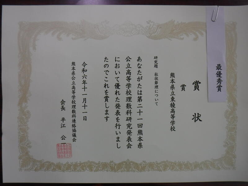 11月11日(月)1・2年の理数コースで、森都心プラザで実施された第21回熊本県公立学校理数科研究発表大会に出かけてきました。本校は地学班が出場し、最優秀賞(2校)の結果でした。九州中四国大会には、もう一校の最優秀賞の熊本西高校が進出します。地学班は発表者としてよく力を出しました。他の生徒も真剣に臨み、他校の発表によく質問をしました。