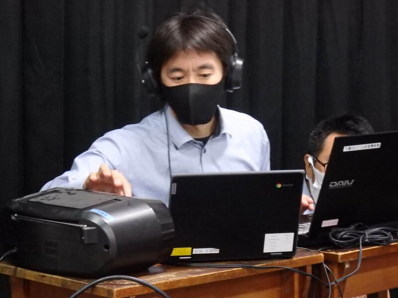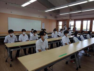 交通委員の生徒が多目的室で、各教室ではオンライン配信で講話を視聴しました。