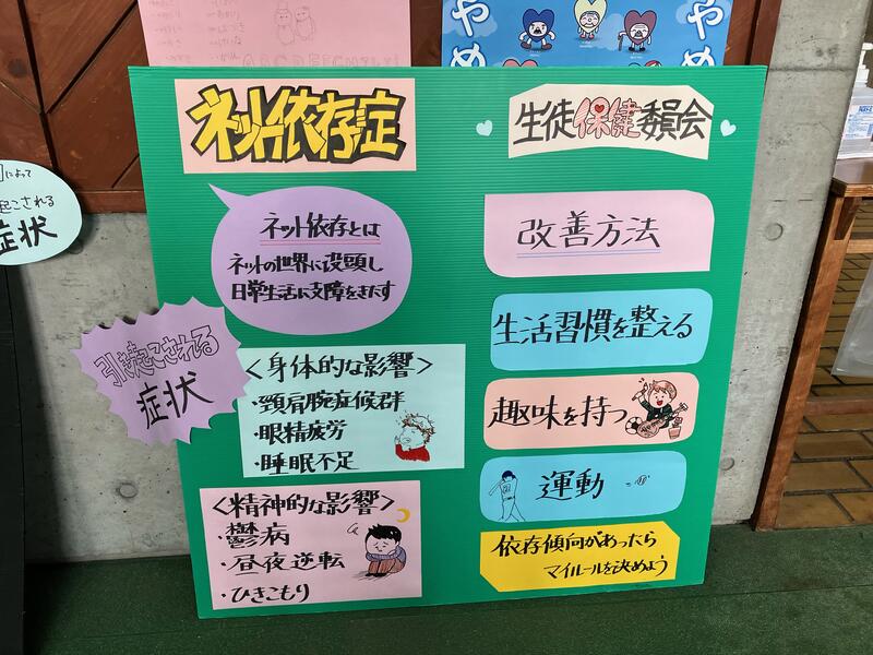 保健委員会では、「スマートフォン利用時の前傾姿勢で起こるストレートネック」に関することをパネルにまとめ、生徒昇降口に掲示しました。「ネット依存症の影響と改善方法について」もまとめ、掲示を行っています。