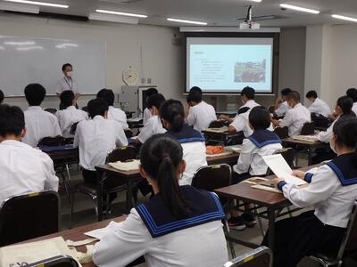 生徒は前のスクリーンに映し出された資料や事前に生徒端末に配布された資料を参考にしながら、講演を聞いていました。