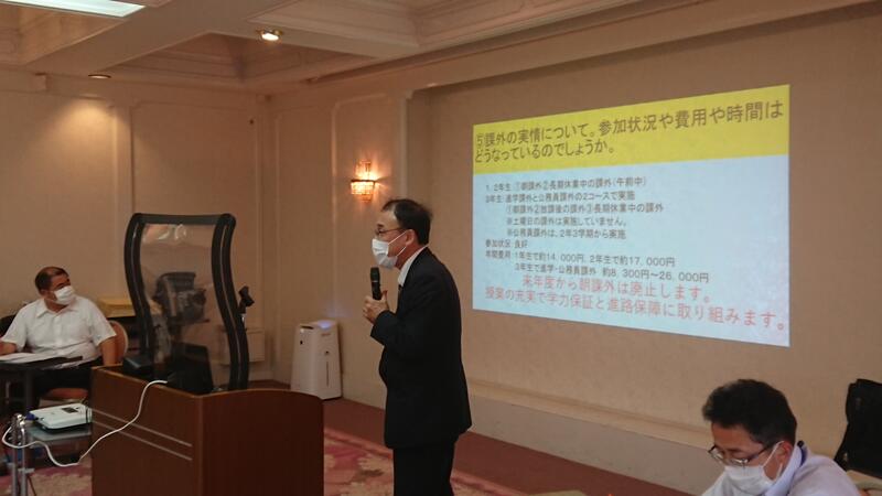 最初に本校の今年度の状況や課題について説明を行った後、主に生徒募集や朝課外、学校の魅力化について活発に意見交換が行われました。第2回は10月に施設見学、授業見学も含めた形で計画予定です。