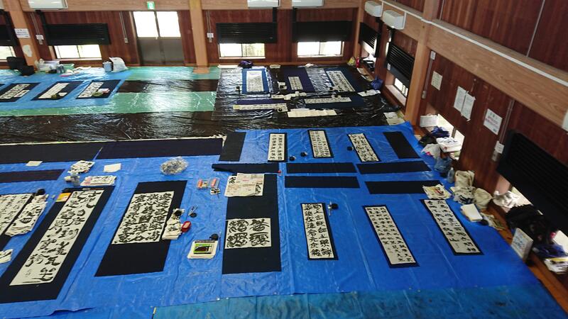午前中は発展コースの生徒がプレ揮毫大会、午後は基礎コースの生徒がプレ揮毫大会、その間は率先して他校の先生方にお声かけをし、御指導をいただきます。みんな今日のために緊張感を持って練習してきました。