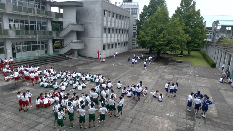雨で体育大会の練習機会も限られる中、午後に貴重な晴れ間。応援リーダーたち主導で団別の応援練習が行われました。短い準備時間のなかで各団の応援リーダーは演舞や構成を熱心につくりあげ、団の生徒たちも手拍子やウェーブで応援に加わります。学校のあちこちから響き渡る太鼓の音色が体育大会へ高まる気持ちを後押ししていました。