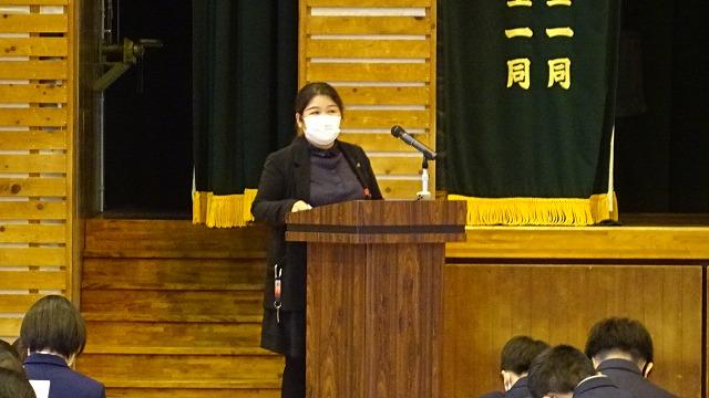 生徒指導主事の村本先生より交通についてとスマホについての大きく2つについてお話がありました。本校では多くの生徒たちが自転車通学をしており、特に朝の時間帯は学校付近の交通量も多いです。一人ひとりが交通ルールを遵守し“死亡事故ゼロ”となるよう最大限の注意をしてほしいとのお話しがありました。またスマートフォンの使い方、SNSの使い方等を各自がしっかりと考え、「自己指導能力」を育成してほしいとのお話もありました。