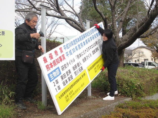 10月20日(日)第70回熊本県高等学校生徒理科研究発表会が崇城大学で行われました。生物部門で本校生物部エビ班の「熊本における淡水産ヌマエビの生息状況~ミナミヌマエビを探して~」が、最優秀賞(1位)を受賞しました。また、昆虫班の「ツマグロヒョウモンはいつ体温調節をしているか~行動別の高度な体温運調節機能~」が優秀賞を受賞しました。