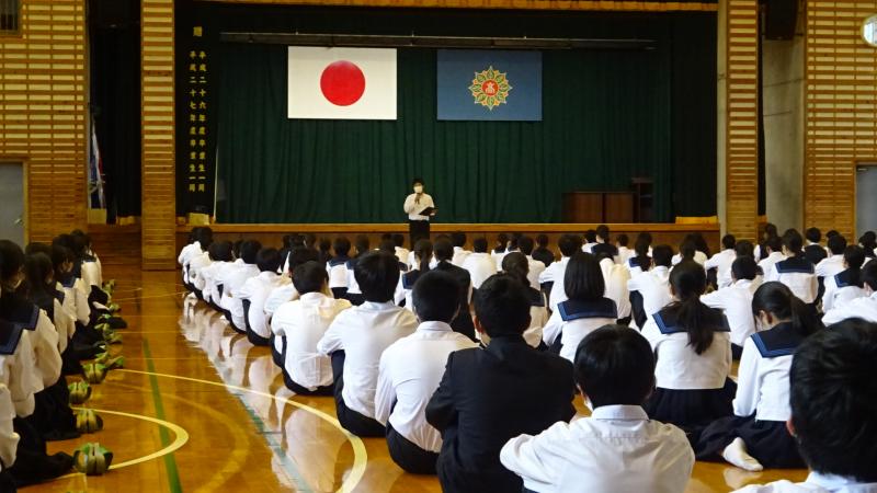 「友人がいけないことをしているときに、良い方向に導く声掛けができるかが重要です。良い方向に成長できる集団であってほしい。また、今回の中間考査はチャンス。3教科で範囲も狭い。だからこそ理解できないところは質問したり、解決するよう努めましょう。」と話をしていただきました。