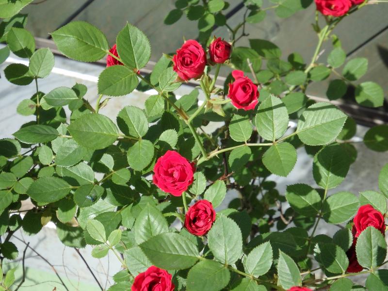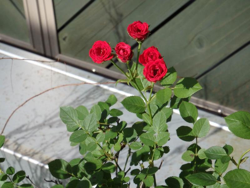 進路指導室横の渡り廊下でバラの花が咲いています。きれいな赤いバラで、ちょうど見頃です。
